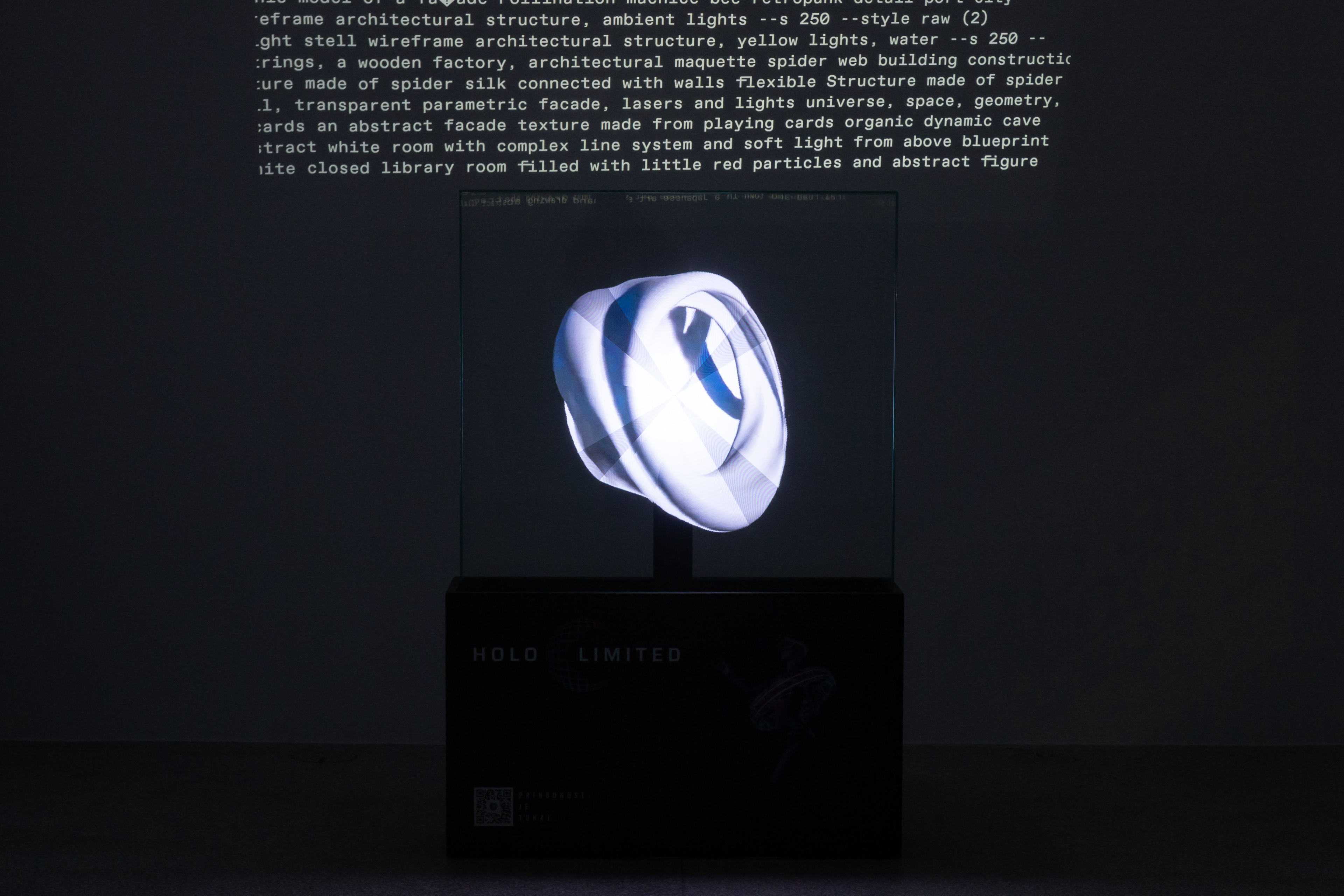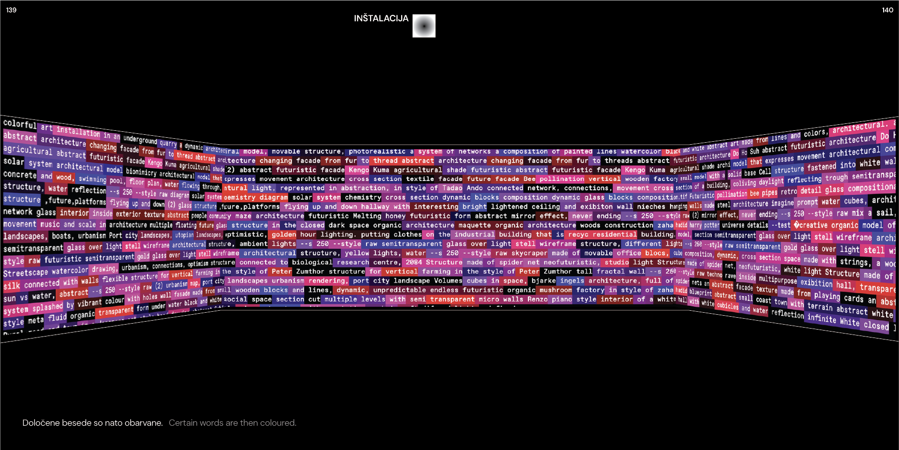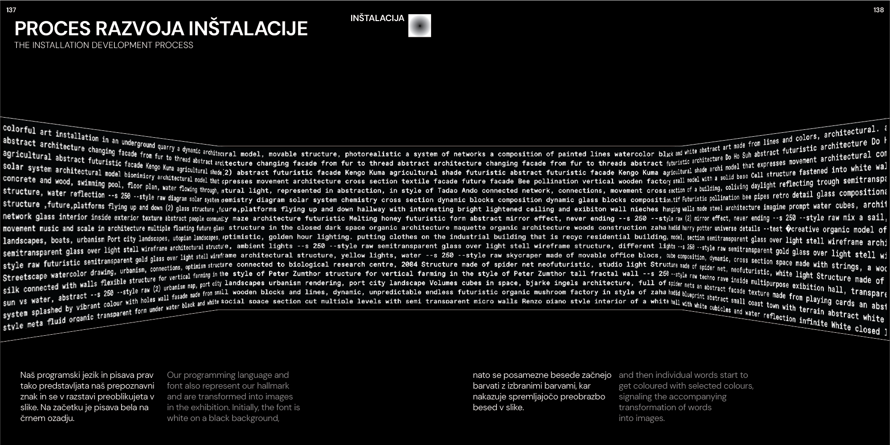 The typography of the exhibition was itself a meditation on transformation. Words began in white on black—the neutrality of text, the raw material of language. Then color emerged, marking the moment of transition from word to image. Selected words, those deemed most generative, were extracted from the field of language and fed into the AI. What emerged was image—visual form born from textual seed.