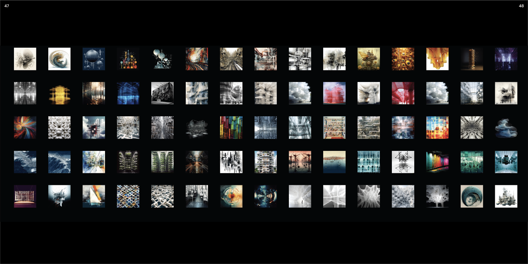 Architecture students and designers collaborated to explore AI's creative potential. Ninety images emerged from architectural concepts, displayed in matrices and connections—a new visual language born from text.