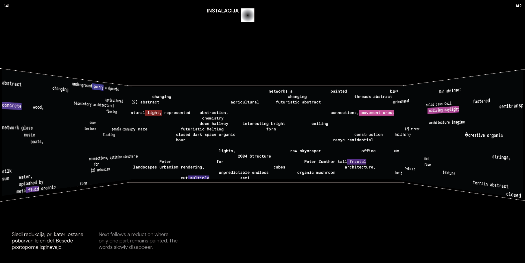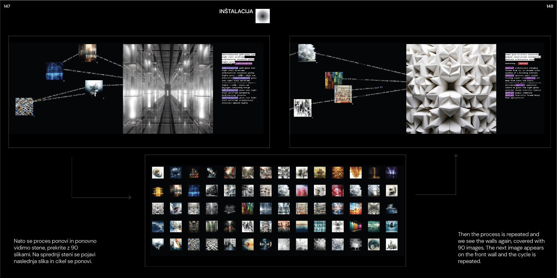 The exhibition that resulted from this research displayed ninety images, each generated from a specific architectural concept. The images were presented in a matrix, but also in relational connections—links between images that shared keywords, themes, or visual languages. The viewer was invited to trace these connections, to see how ideas morph and transform across the space of the gallery.