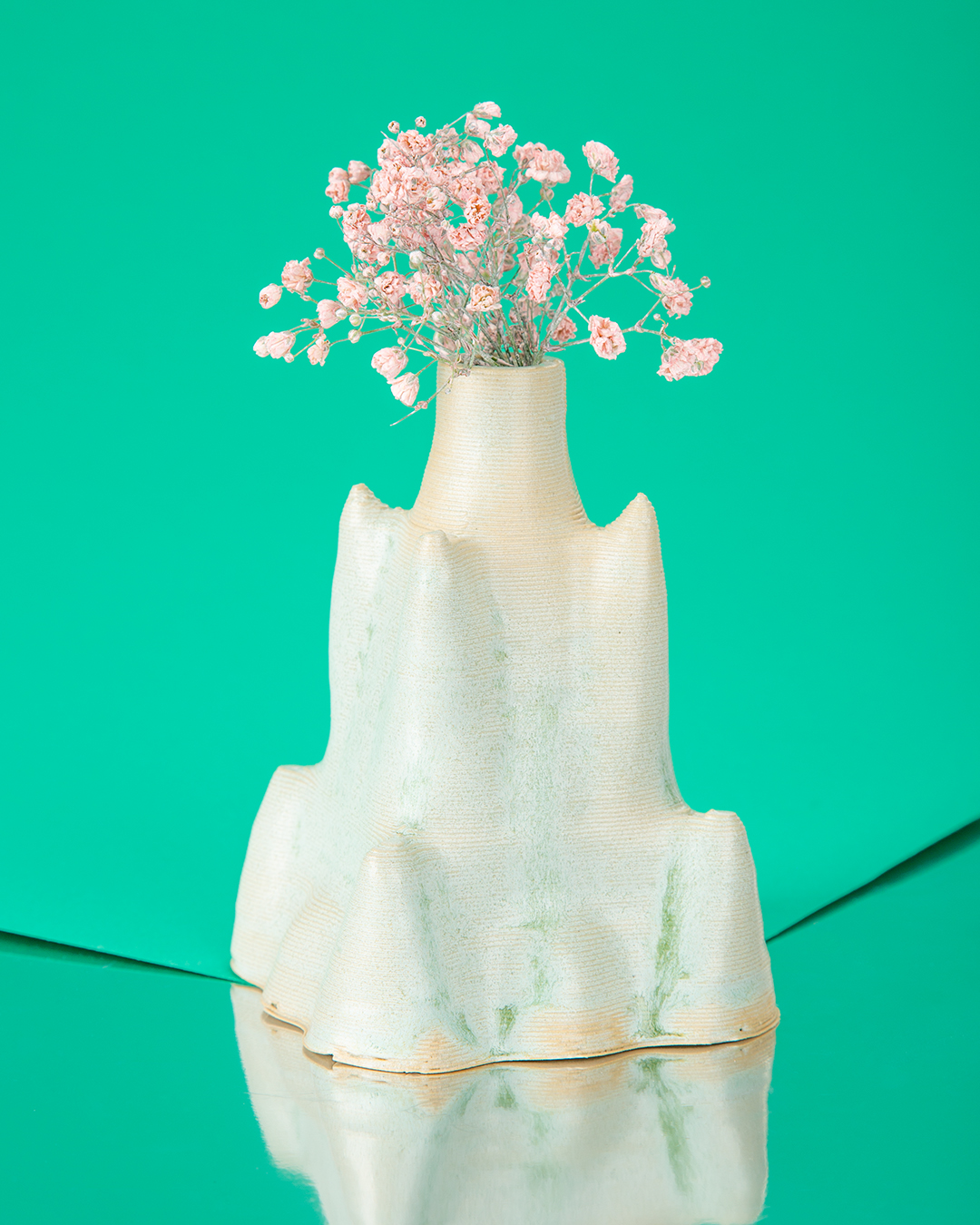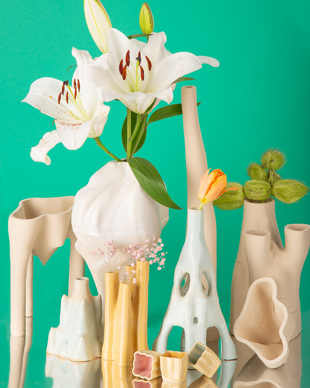 The designer sets parameters; the algorithm generates form. A 3D clay printer brings the digital into the physical, producing vases in varied sizes, colors, textures. A collaboration between human, code, and material—design as emergence.