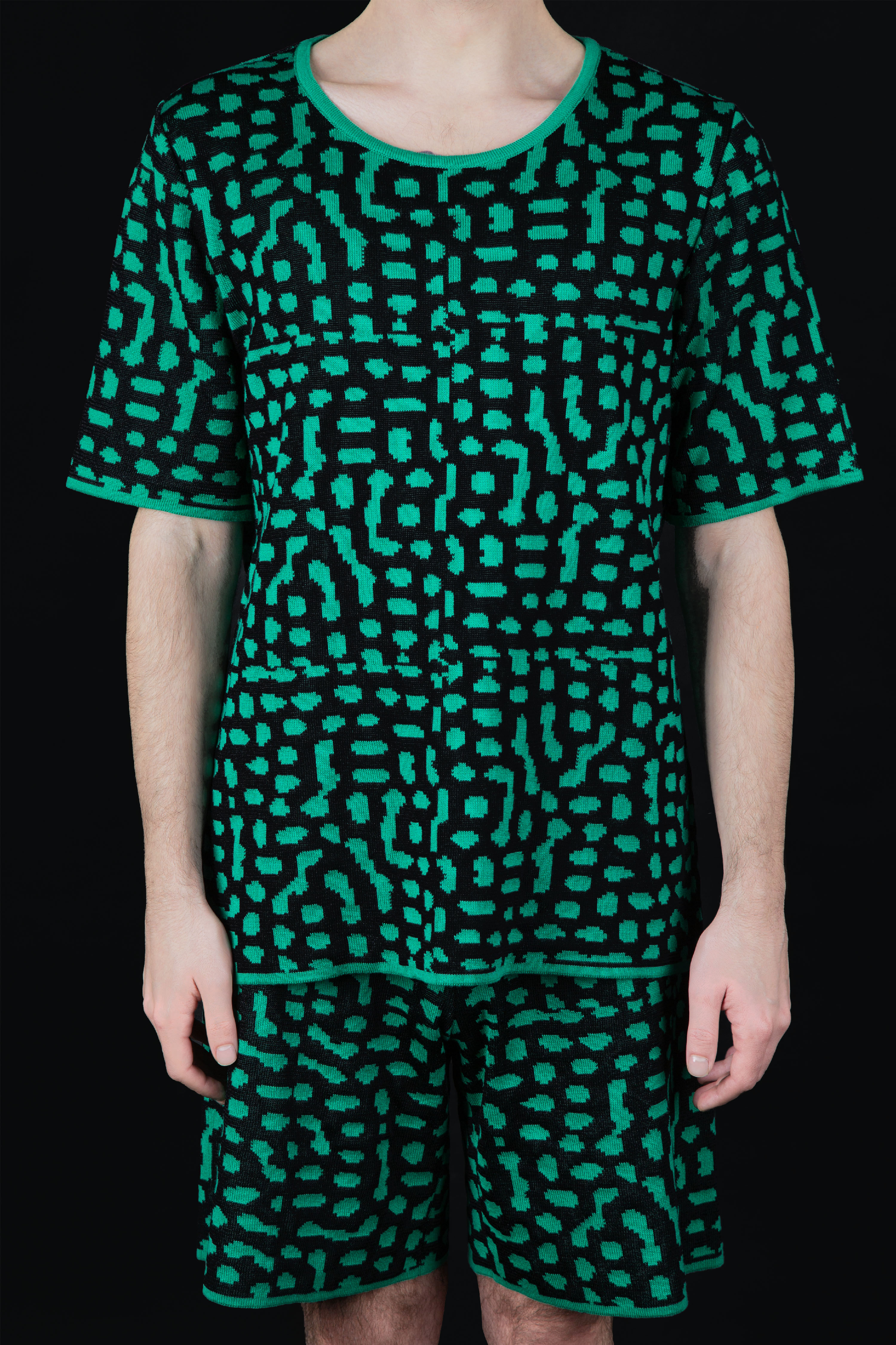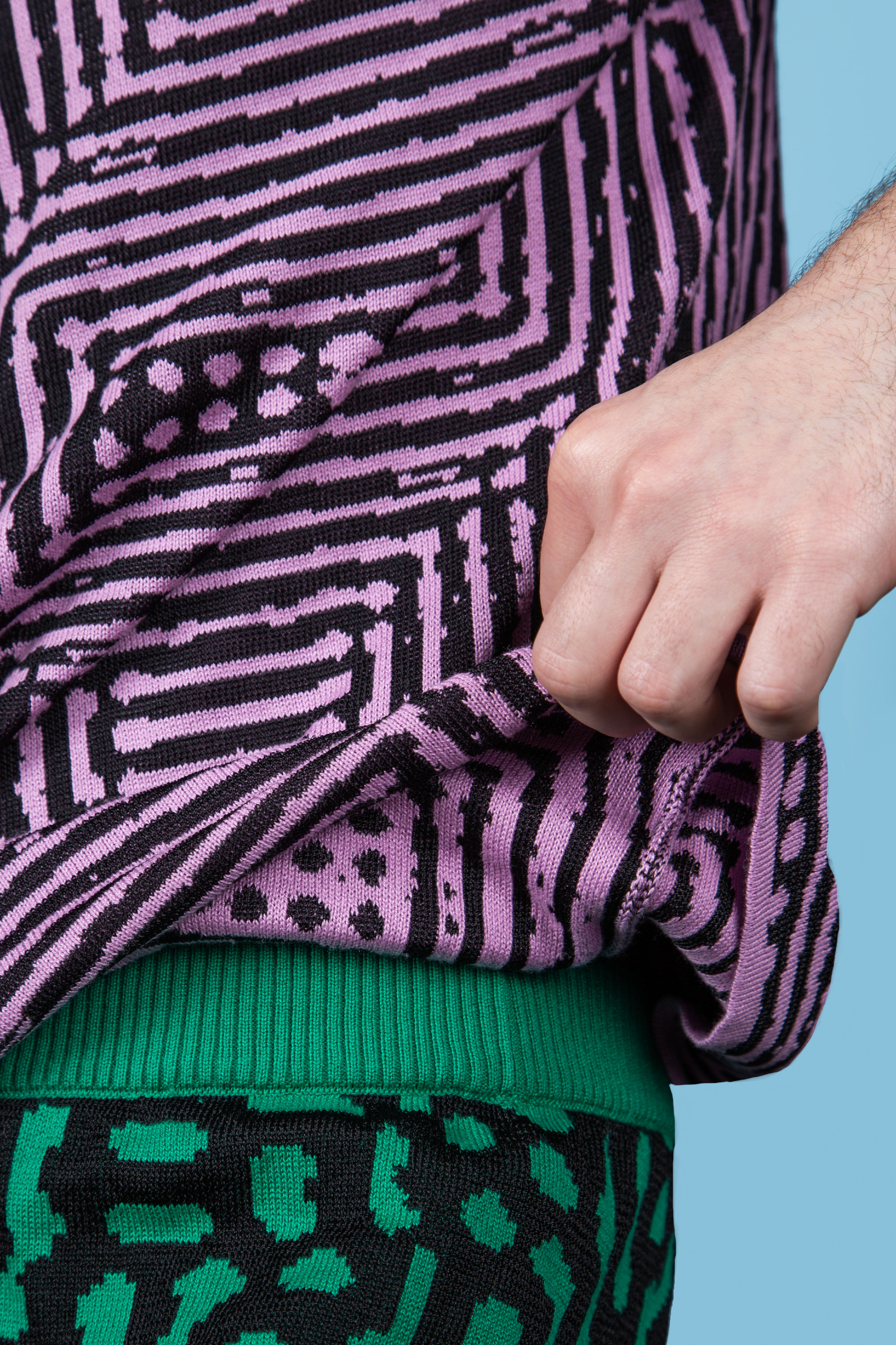 For Fussil Textile, these vector graphics become patterns. They are knitted with cotton yarn, in varying colors, thicknesses, and forms. The translation from screen to fabric is not direct; it involves decisions about scale, about material, about the relationship between pattern and body. The designer chooses which forms to realize, how to adapt them to the constraints of knitting, how to position them on the garment. The algorithm provides the raw material; the designer shapes it into something wearable.