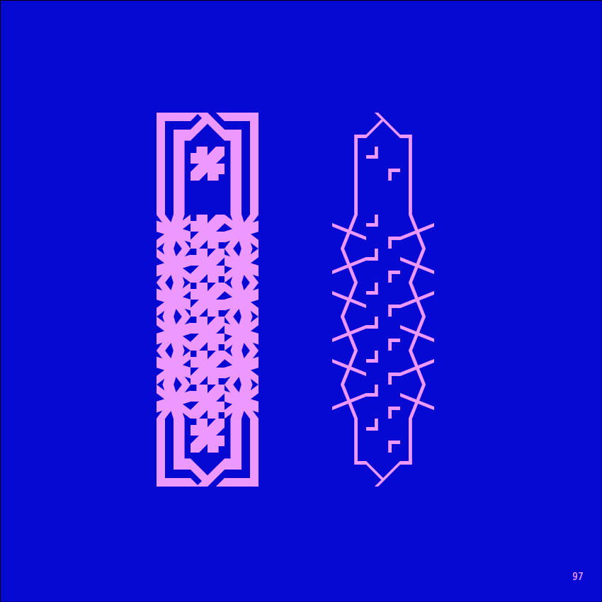 Inspired by 15th-century Moresque ornament, this modular system brings historical pattern into contemporary typography. Different thicknesses, different sizes, infinite combinations. A new way of writing, built from ornament.