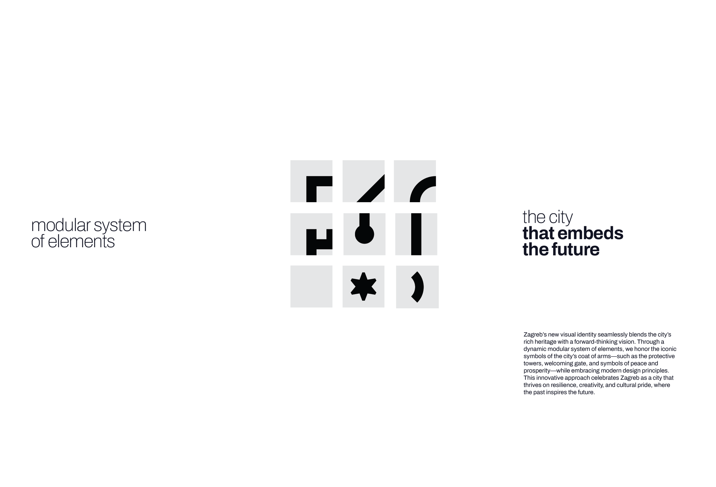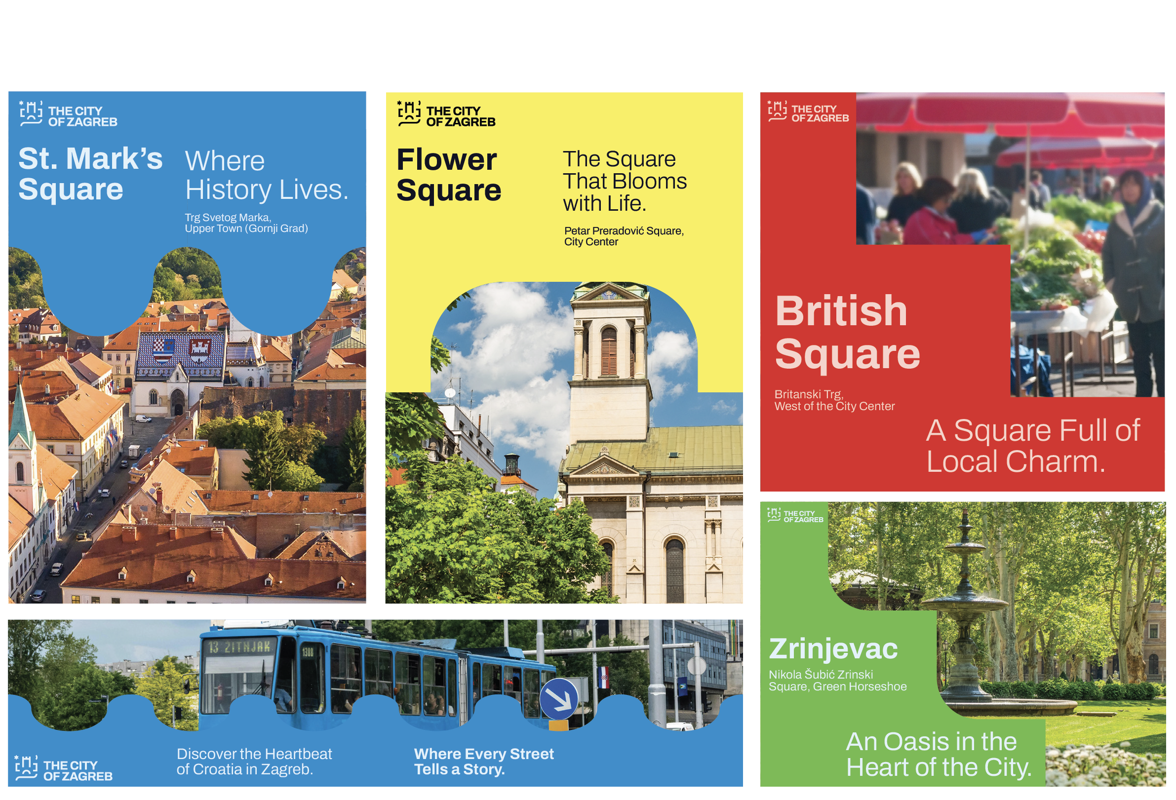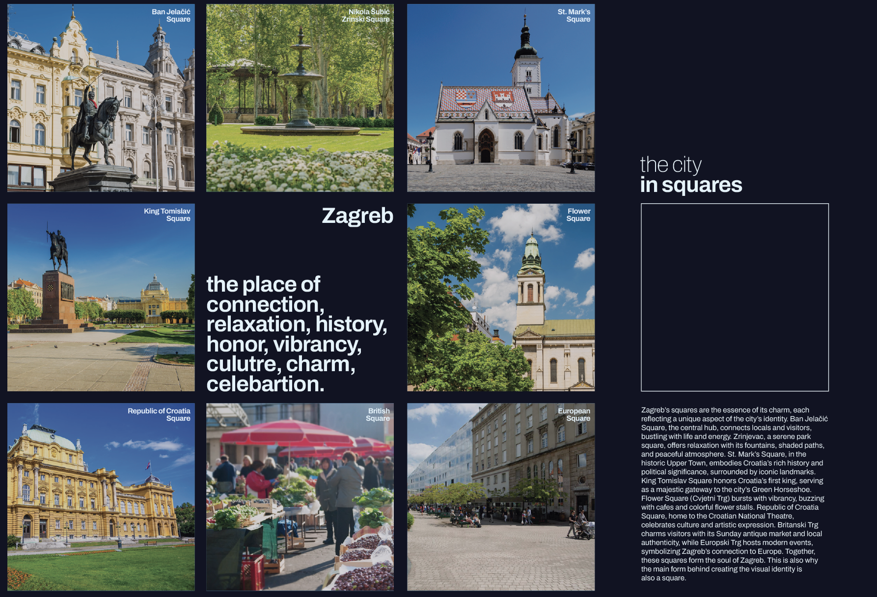 Zagreb's squares are its soul—Ban Jelačić, Zrinjevac, St. Mark's, and beyond. The visual identity honors this with a modular system built from the square form: a flexible, evolving language that captures the city's structure, warmth, and enduring spirit.