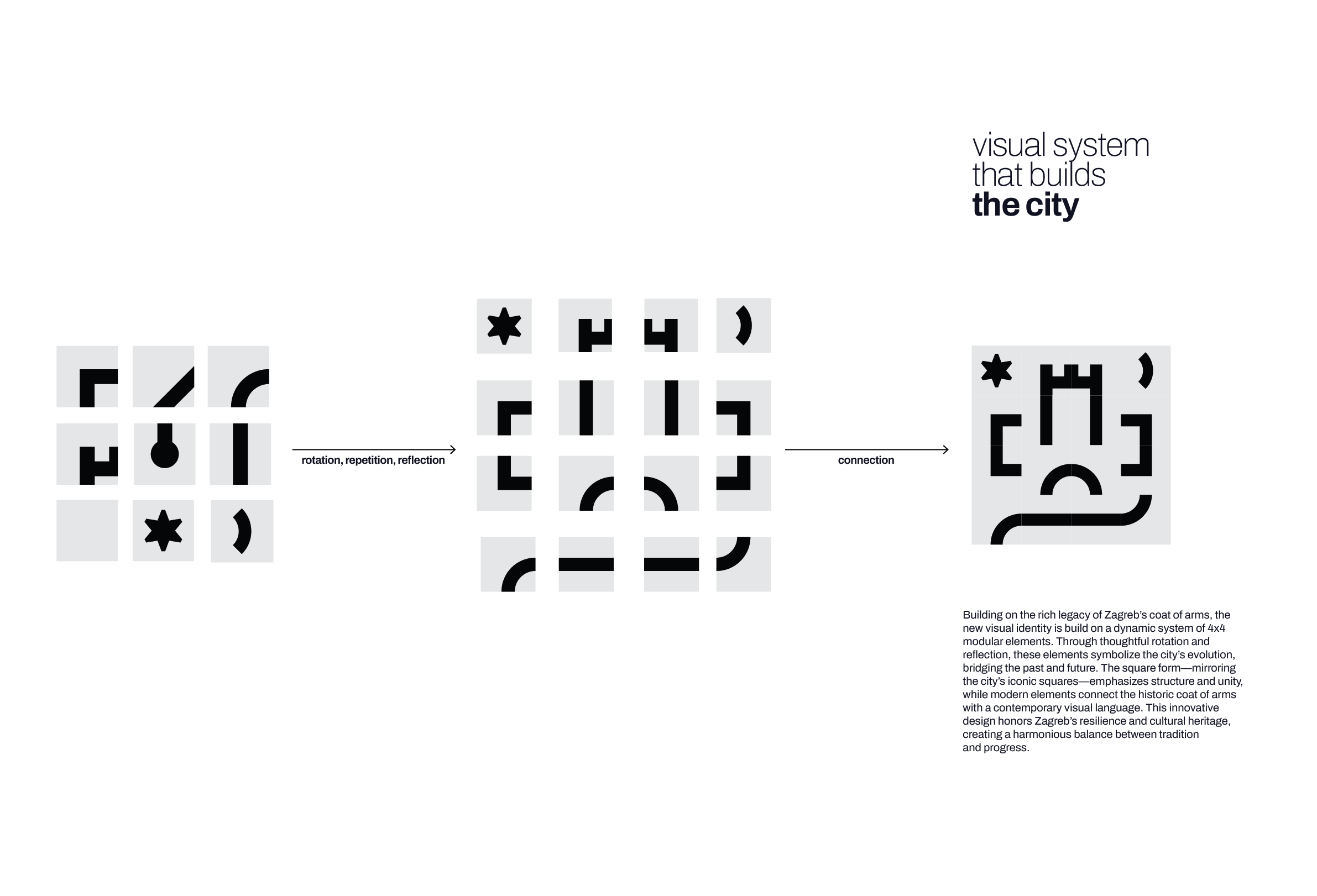 The new visual identity for the City of Zagreb begins with this observation. The square becomes the foundational form: a module that can be rotated, reflected, repeated, and combined. It is a system built for flexibility, for the complexity of a city that is at once historic and modern, traditional and cosmopolitan, rooted and open.