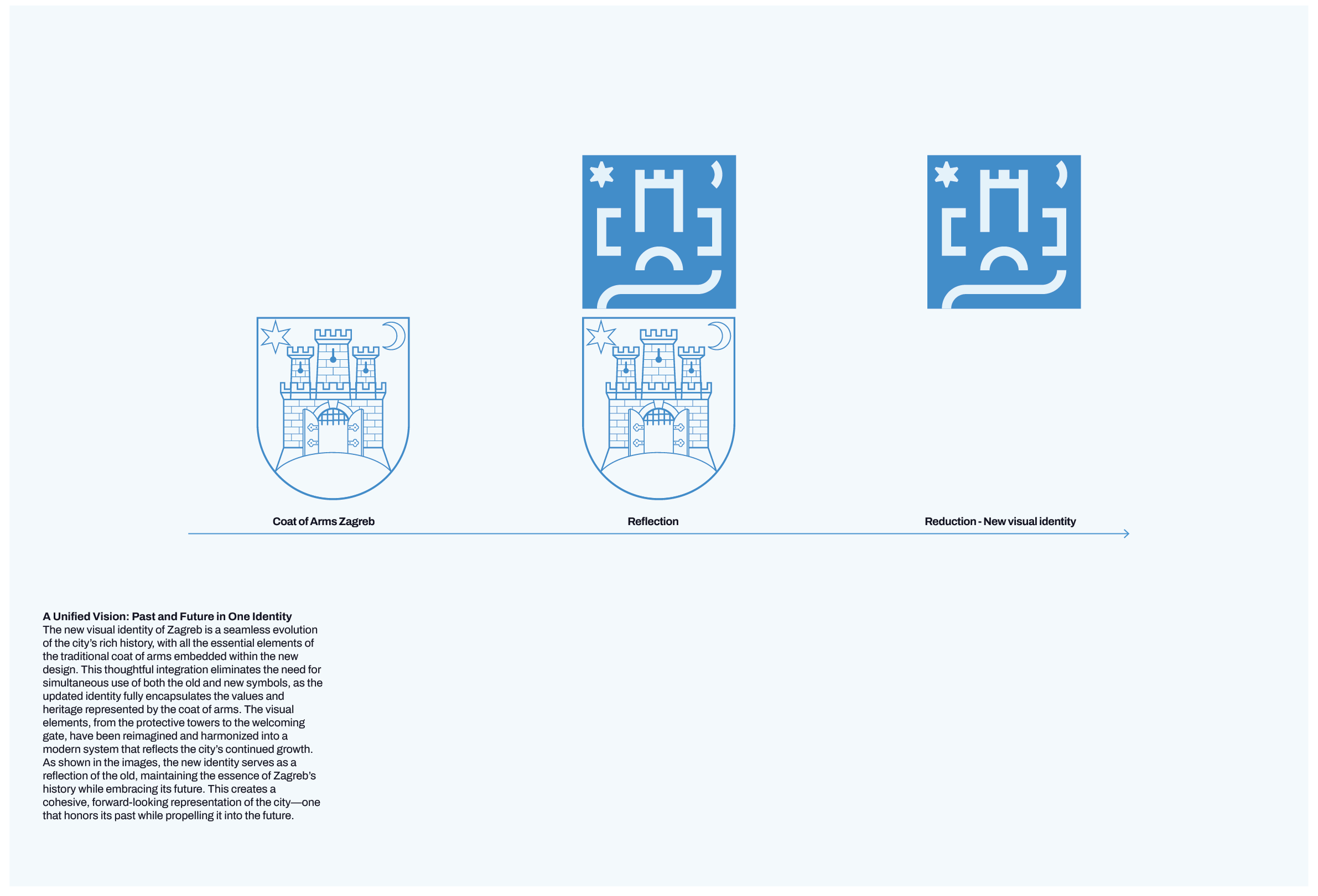 The identity draws on other deep sources. Zagreb's coat of arms—the blue shield with its white city gate and three towers, the golden star and crescent moon above—provides a vocabulary of protective strength, peace, prosperity, welcome. These elements are reduced, abstracted, woven into the modular grid. The towers become shapes; the gate becomes an opening; the star and moon become gestures of hope.