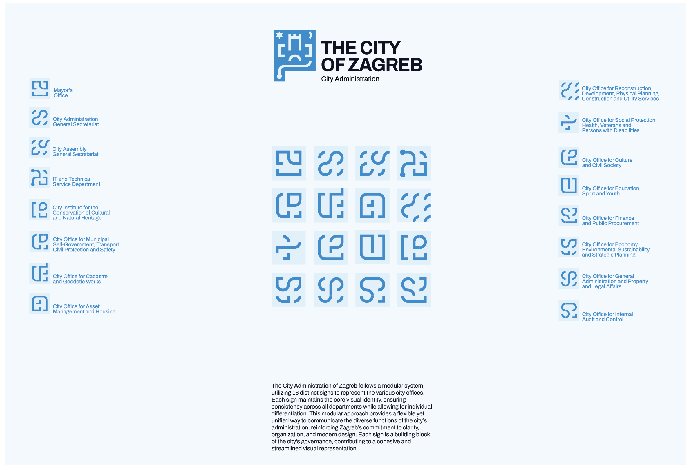 Black and white for history; two blues for the city's signature colors and forward momentum. The new visual identity of Zagreb balances heritage and innovation, building a flexible system from the elements that define the city: squares, lace, and an open gate.